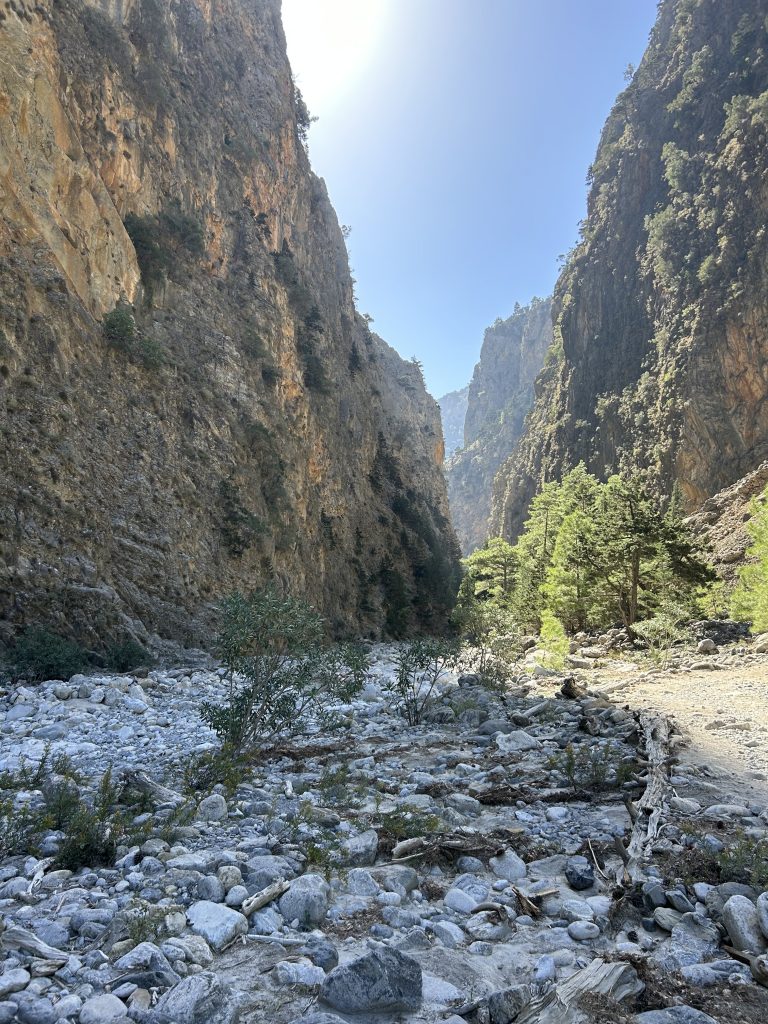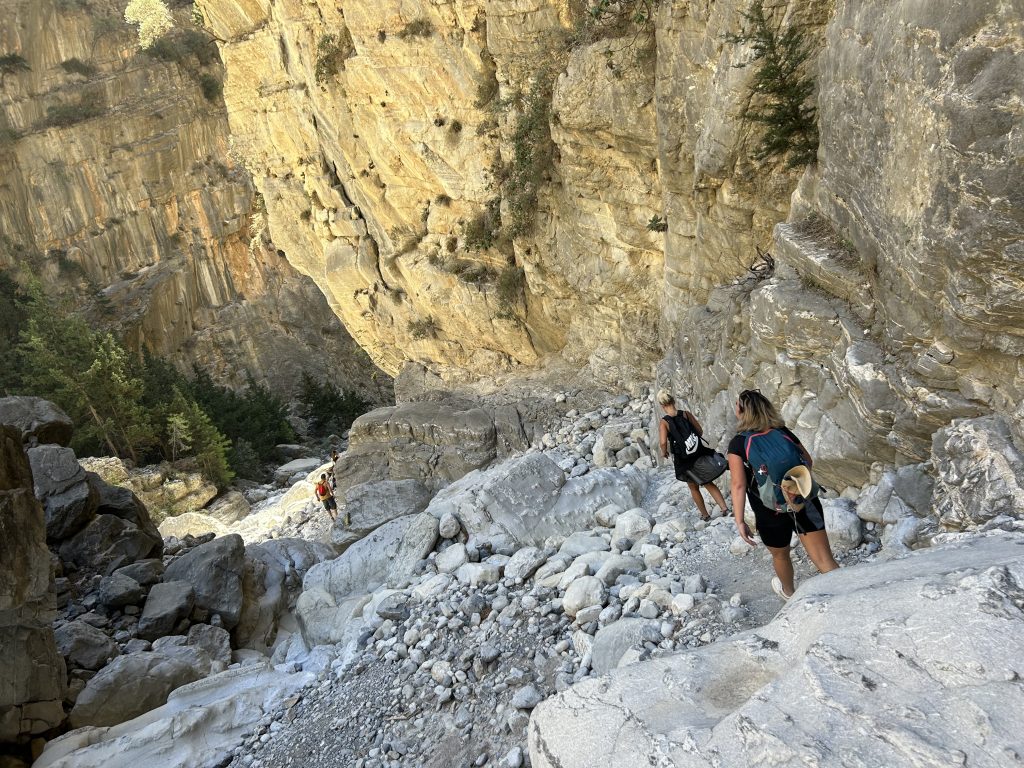 Nasze przewodniczki przywitały nas już w autobusie, wyjaśniając plan dnia i dając nam kilka cennych wskazówek. Kiedy dotarłyśmy do wejścia wąwozu, słońce było już wysoko nad górami. Początek szlaku był stromy i kamienisty – pierwsze cztery–pięć kilometrów były najtrudniejsze. Podłoże było nierówne, pełne luźnych kamieni, więc trzeba było uważać na każdy krok. Ale świeże powietrze, szum wody i ekscytacja tym, co przed nami, dodawały nam sił.
